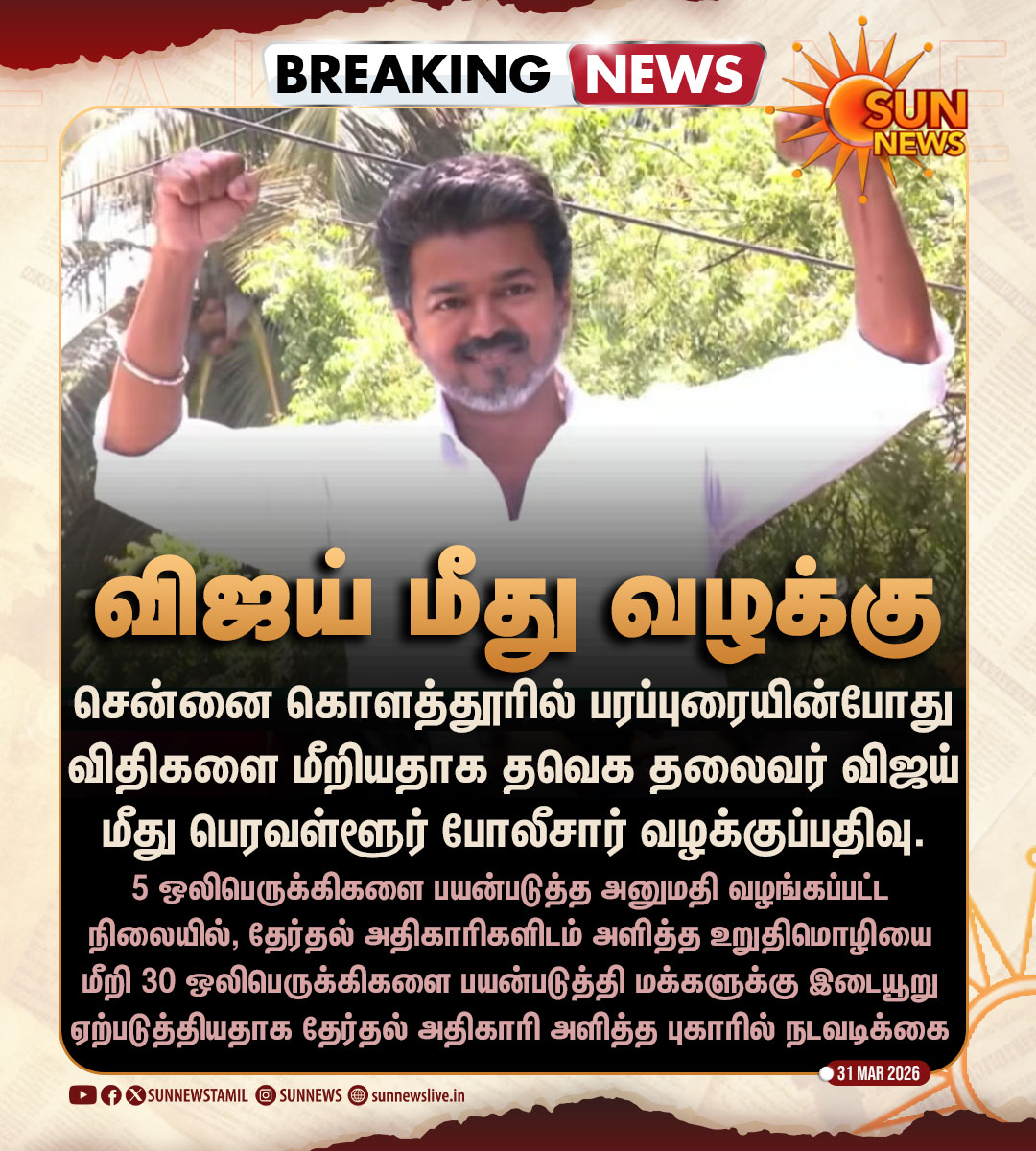 - #BREAKING | பரப்புரையின்போது விதிமீறல் - விஜய் மீது வழக்குப்பதிவு #SunNews | #TNElectionWithSunNews | #TVKVijay pic.x.com/ijHJJXiMm0 — Sun News (@sunnewstamil) Mar 31, 2026 #BREAKING |…
