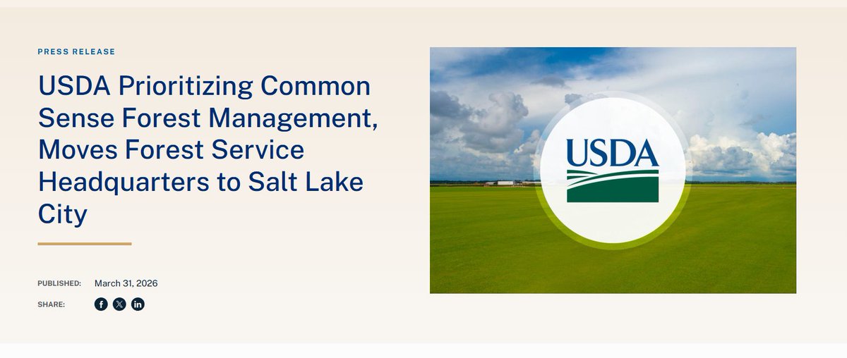 #Breaking @USDA Moves Forest Service Headquarters to Salt Lake City; and begin a sweeping restructuring of the agency. usda.gov/about-usda/new… pic.x.com/39E2y6eVE1 — Ryan Sprouse (@RSprouseNews) Mar 31, 2026#Breaking @USDA Moves Forest Service Headquarters to Salt Lake City; and begin a sweeping restructuring of the agency.